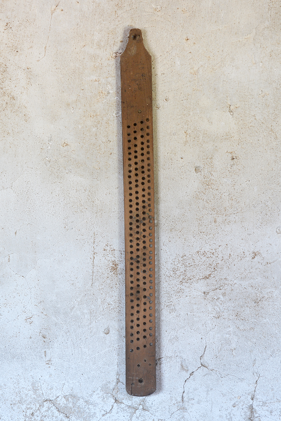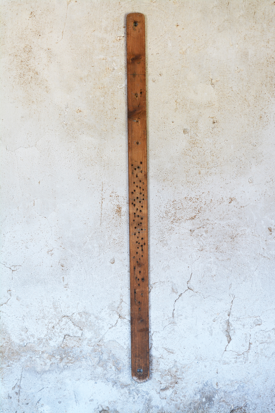 A számtalan apró lyukkal átfúrt mérőlécek a kerekes állítható méretű célszerszámai. Segítségükkel a készülő kerék külső ívének a meghatározását végzik el, ezzel írják körbe a fentőkkel már ellátott kereket, vágják le azok hosszát, majd tervezik meg a kerékfal ívét.