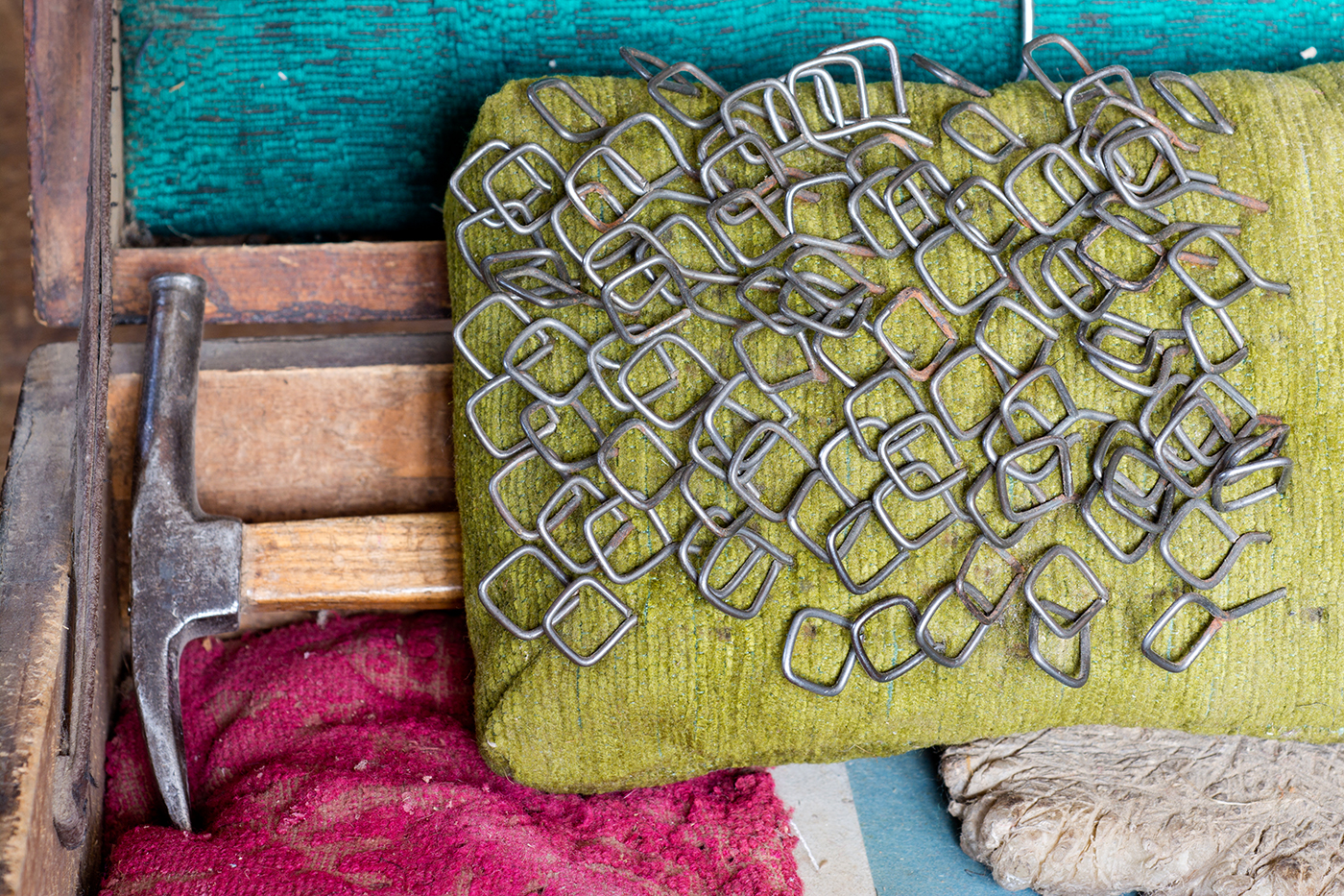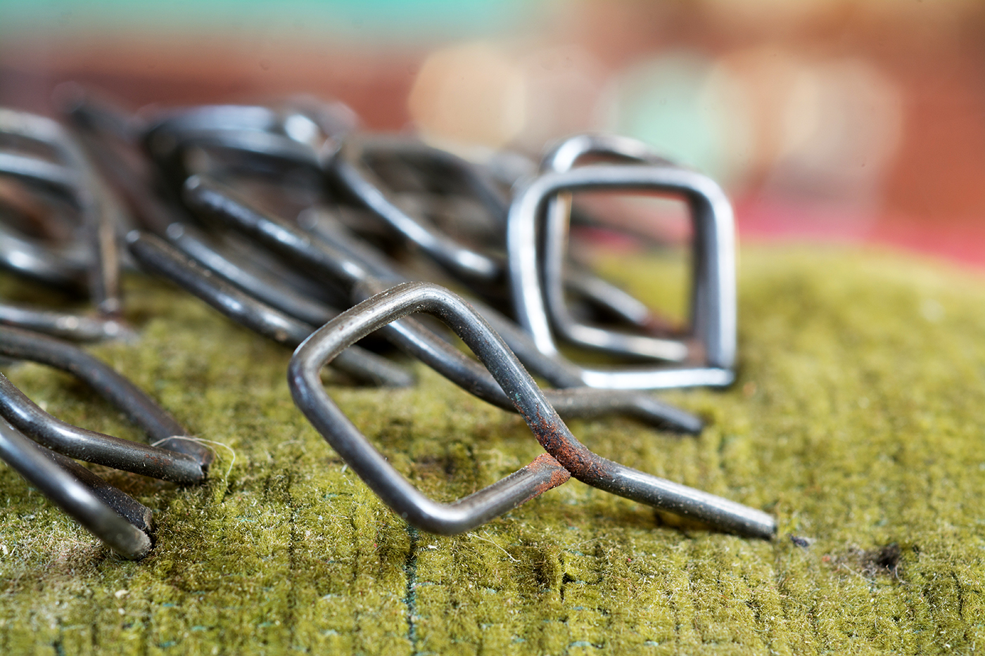 A kárpitos a párnába szúrva tárolt kitűzőtűkkel a bevonat anyagának az előzetes rögzítését, a méretezés előkészítését végzi.